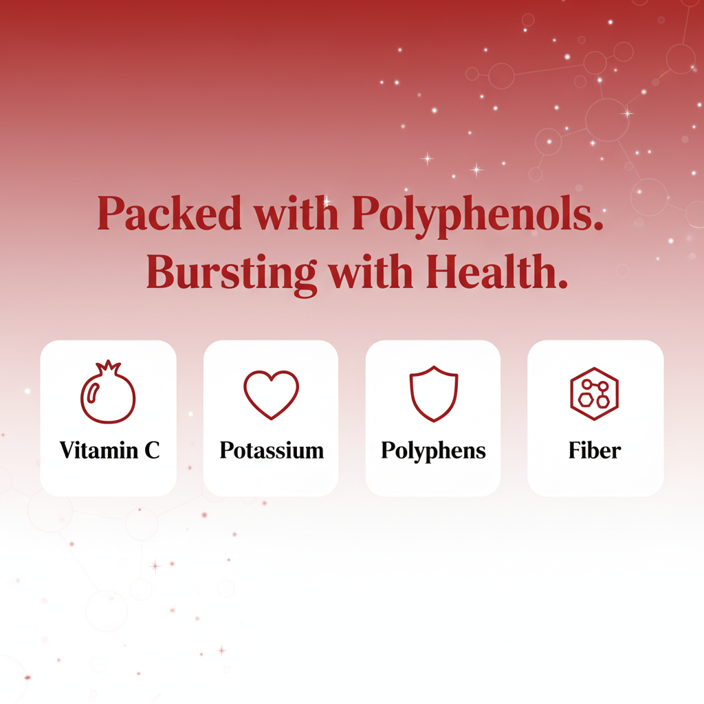 Pomegranate (Punica granatum) is packed with polyphenols like punicalagins and anthocyanins, which give it its vibrant red color and powerful antioxidant properties. These compounds help neutralize free radicals, reduce inflammation, and support cell repair.